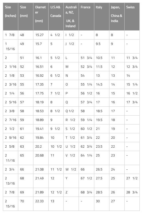 Size (Inches) | Size (mm) | Diameter (mm) | U.S.A& Canada | Australia, NZ, UK, & Ireland | France | Italy | Japan, China & India | Swiss |